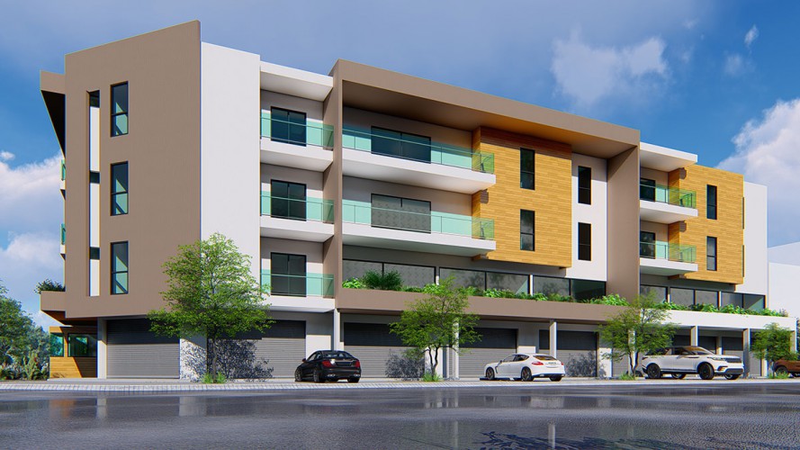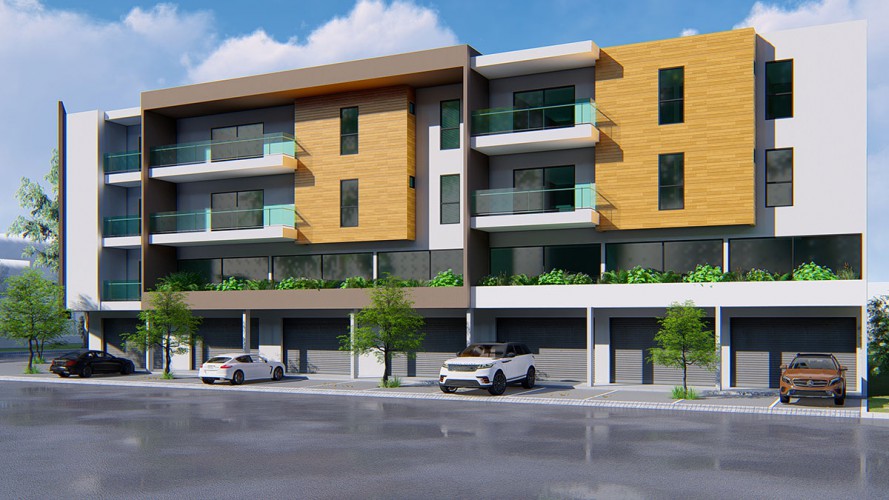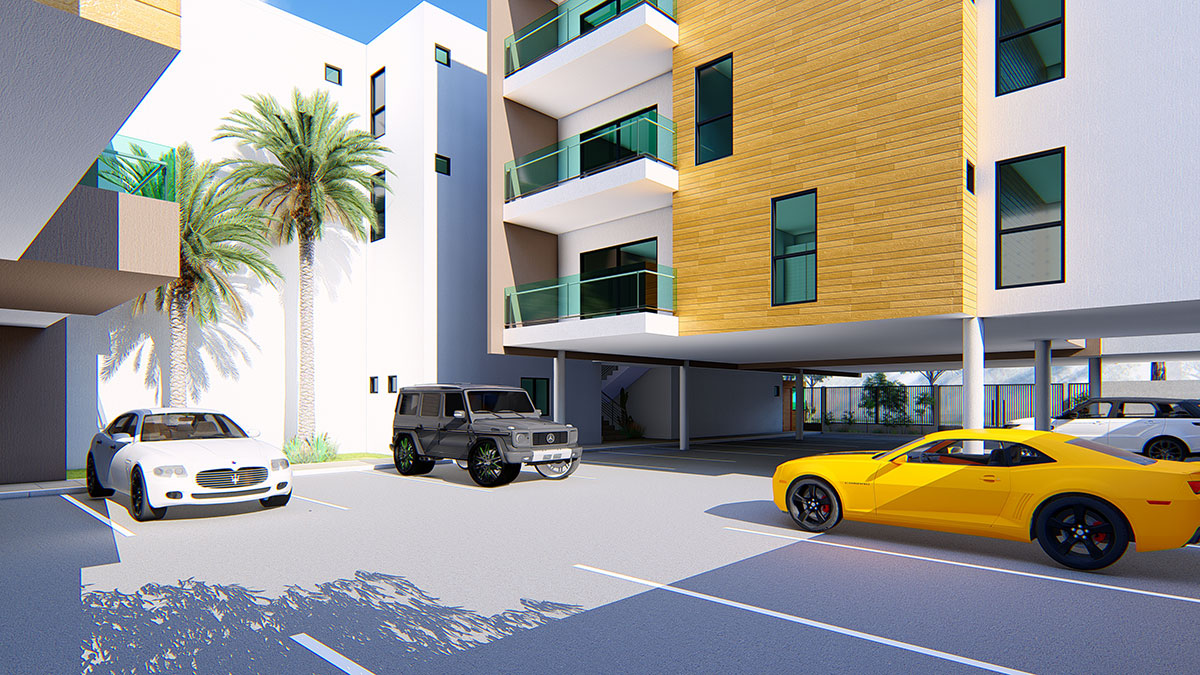 Sur une superficie de 1180m2 est bâti un ensemble en U de bâtiment R+3 contenant des appartements de 3 et 4 pièces, des parkings et des boutiques, dans la commune de Cocody, 7ème tranche comprenant: